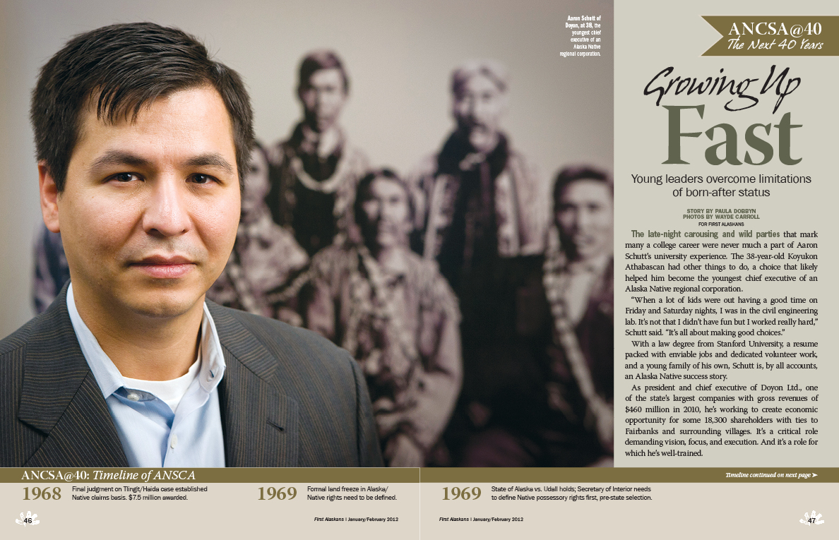 The January/February edition of First Alaskans magazine hit the streets a couple weeks ago and I thought I would take a moment to share some of my favorite pages. It’s a special edition looking closely at the Alaska Native Claims Settlement Act, a bill that forever changed Alaska and wrote a significant chapter in Alaska Native history. I’m so proud to continue with this decade-old publication even after it has changed hands from Calista Corporation to its new home with First Alaskans Institute. I’m very pleased with the purpose the magazine serves in Alaska, giving a voice to the Alaska Native community, sharing its stories, heritage, culture and business news.