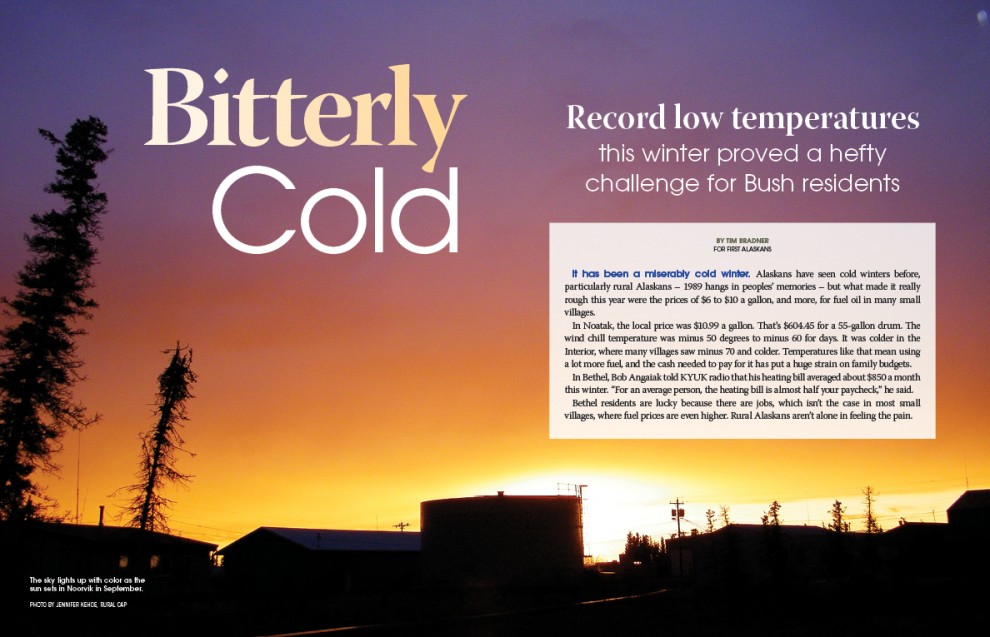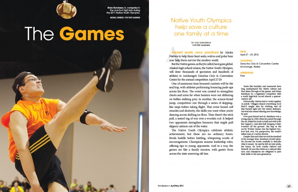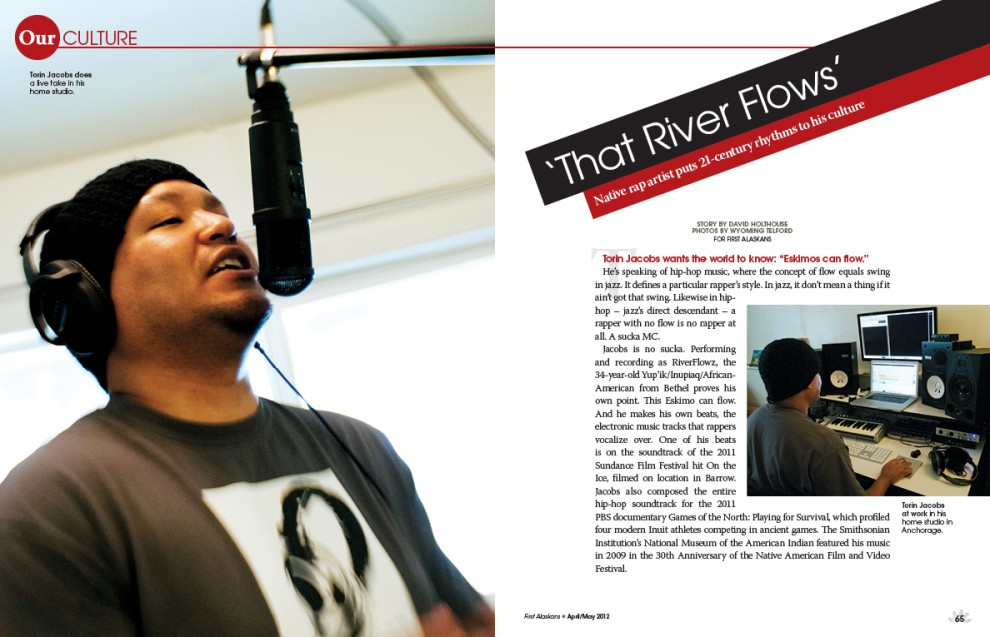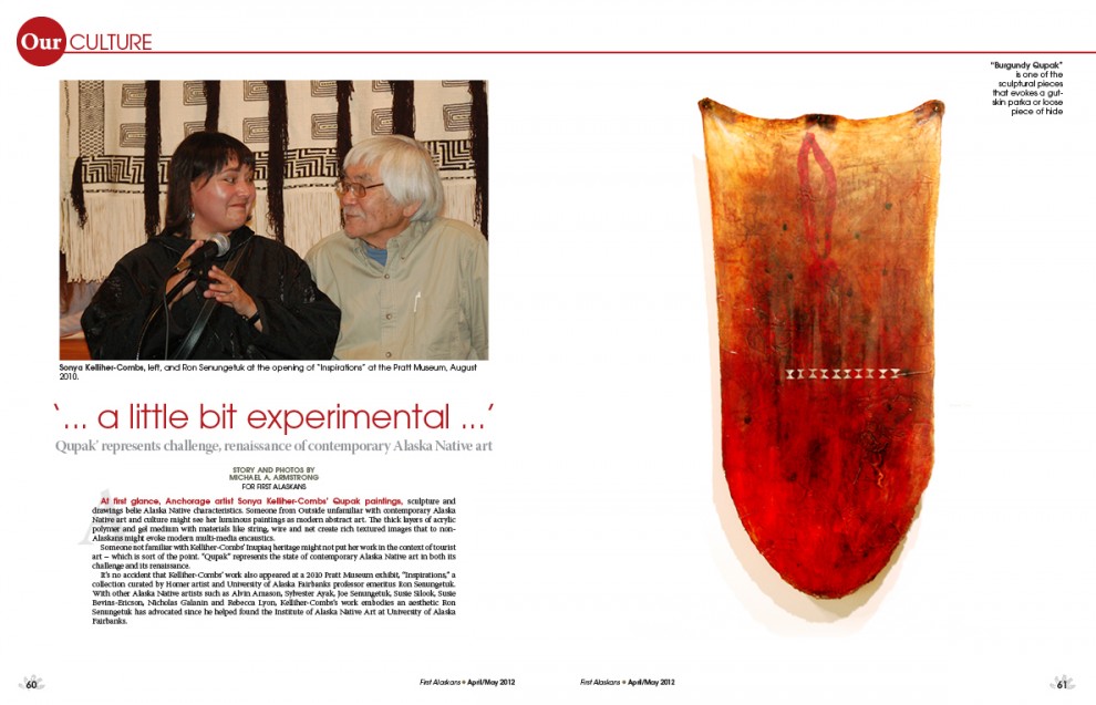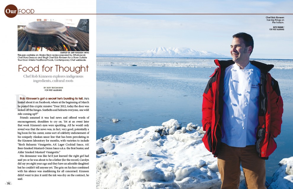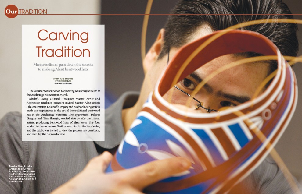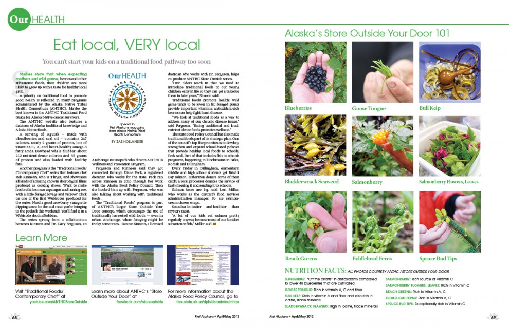 There are still plenty copies of the current edition of First Alaskans, but I’m busy plugging away at the next issue. Before it’s replaced with the next edition, I wanted to share some of my favorite pages. We gave the magazine a mini design facelift this edition with one new font and a few eliminated to streamline the look and make the design cleaner, more modern. You might also notice new department labels that display the word “Our” in a circle, one of many little changes as the magazine truly makes itself at home with First Alaskans Institute’s vision. Instead of “Traditional Food” and “Native health” new department labels speak like an insider, not observer of Alaska Native culture — Our Culture, Our Health, etc. I’m continually proud of the work we do here with this publication. Now back to get back to designing the next edition!