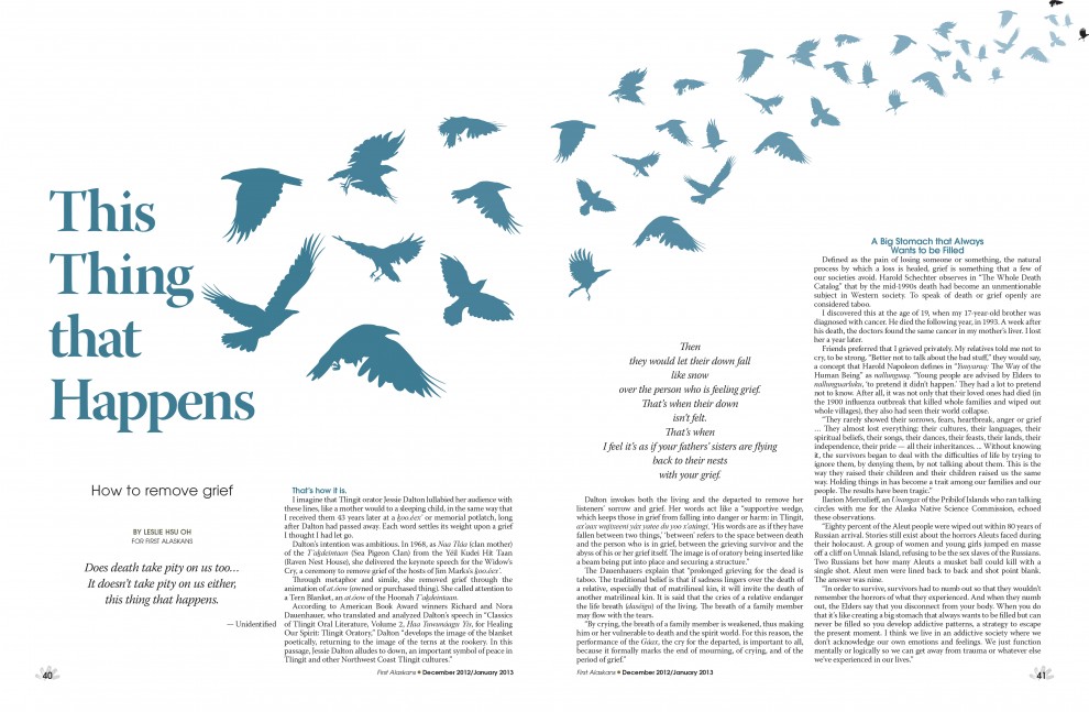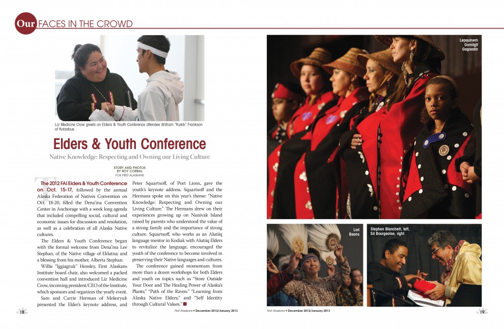 The December-January edition of First Alaskans will still be available on newsstands for another month. You can find it at Barnes & Noble in Anchorage in the Alaska magazines section. We had pages and pages of amazing photos from the Elders & Youth Conference and Alaska Federation of Native Convention. Plus some really wonderful stories about giving and grief. Please pick up a copy and take a look!
